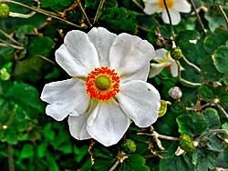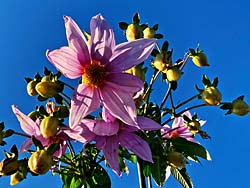 左から、中国原産でキンポウゲ科の多年草「シュウメイギク(秋明菊)」です。 中国原産でメギ科の常緑低木「ナンテン(南天)」です。 そして、小さな柿が鈴なりになっていました。
