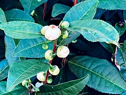 近くにはお茶畑が広がっています。 今、お茶の木には花が咲いています。その花が咲き終わり、春先から新芽が伸びて5月頃になると、茶摘みが行われ新茶が生産されるのです。
