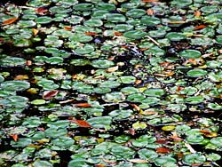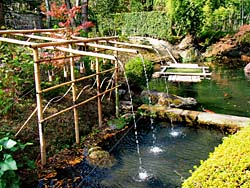 京都府八幡市にある「松花堂庭園」その3です。 竹を組んだ滝が作られていました。何故このようなものが作られているのかは、わかりませんでした。そこに睡蓮のような水草がありました。ミツガシワ科の多年草「アサザ」で、準絶滅危惧種に指定されています。夏から秋にかけて黄色い花が咲きます。平成16年に八幡市内の河川に、自生しているのを発見されて、ここに移植されたとか。