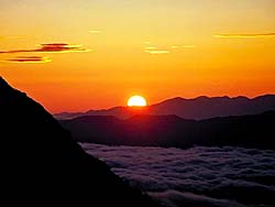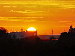 木津川の土手から見た夕陽です。木津川からの夕焼け空を見るのは初めてでした。振り返ると月が天井に昇ってきていました。