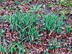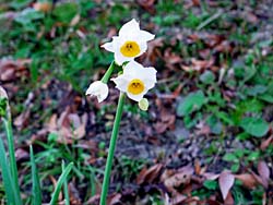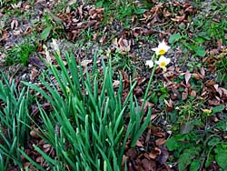 木津川の土手に桜並木がありますが、その根元に水仙が植えられています。今は、写真左のような状態が普通ですが、1本だけなんと花が咲いていました。