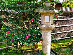 京都府八幡市にある「松花堂庭園」その5です。 竹で編んだいろいろな垣根があります。これは、「建仁寺垣」です。山茶花が赤い花を咲かせていました。