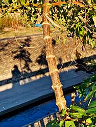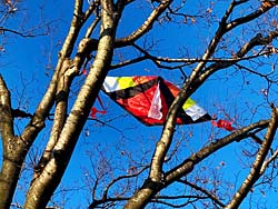 桜のきれいな近くの古川は、今はこのような状態ですが、春になれば咲くように小さな蕾が出来ています。枝には、お正月の名残の凧が北風に寒そうに揺れていました。
