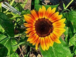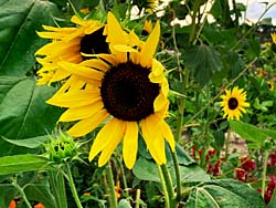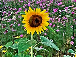 真夏の花と言えば、キク科の1年草「ヒマワリ(向日葵)」ではないでしょうか。多くの向日葵は、黄色一色ですが写真中央のように、色が違う2色のヒマワリが咲いていました。