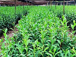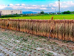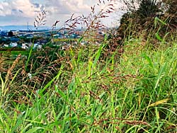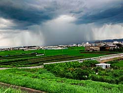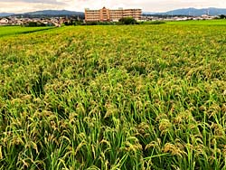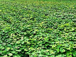 8月下旬の周辺の畑です。 左から、田圃の稲に稲穂が出始めました。 城陽特産の寺田イモのツルが、畑一面に広がっています。 5月の茶摘みの後、丸裸にされていたお茶でしたが、今は青々と枝が広がっていました。