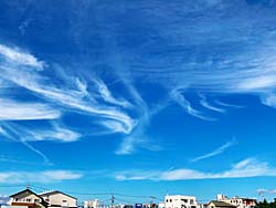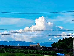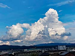 筋雲、うろこ雲が見られるようになりました。秋の雲です。振り返ると遠くに、小さくなった入道雲が見られます。夏と秋が入り混じっています。「夏と秋