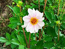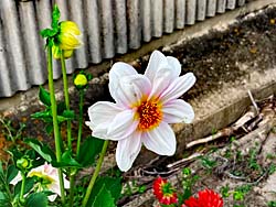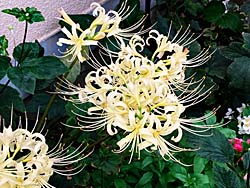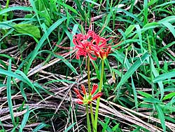 草むらに、ポツンと咲いていた彼岸花と、あまり見かけない、白い色の彼岸花です。 そして、ダリアも咲いていました。