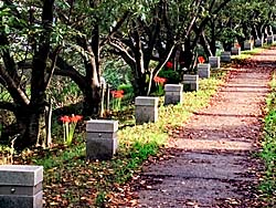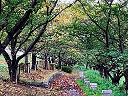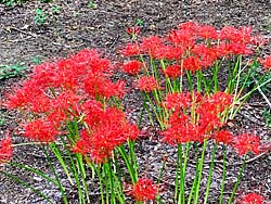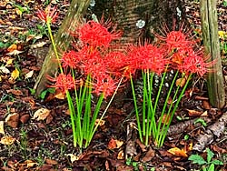 いつもの桜並木ですが、ソメイヨシノの1本、1本の根元に「彼岸花」が咲いています。今見頃を迎えています。