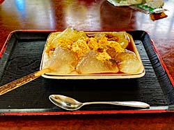 浄瑠璃寺その4です。 本堂です。この戸を開けると、九体の阿弥陀如来座像が並んで居られます。この前に座っていると心が落ち着き、たびたび訪れる理由の一つです。振り返ると、石臼のような中に睡蓮がありました。そして、帰り道にあった茶店でわらび餅を食べました。