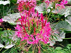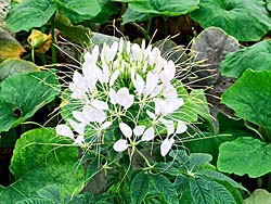 田圃の片隅に咲いていた、熱帯アメリカ原産でフウチョウソウ科の一年草「クレオメ」(和名)セイヨウフウチョウソウ(西洋風蝶草)です。放置されているので、葉がうどんこ病らしく白くなっていました。