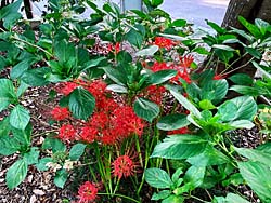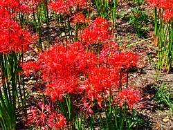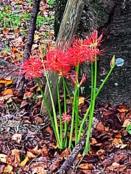 石田神社の参道には、彼岸花が見頃です。紫陽花の葉に囲まれながら咲いているのもありました。