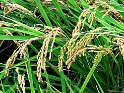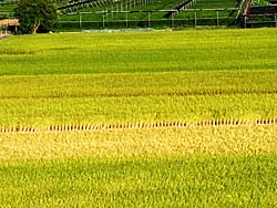 稲刈りが始まりました。 今はほとんどがコンバインで刈り取るので、刈り取ると同時に脱穀、稲は切り刻んで田圃にまき散らします。それで、写真右のような風景を見ることは、少なくなってきました。