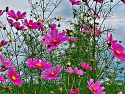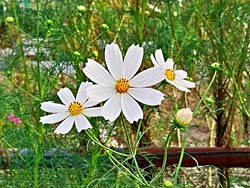 シソ科の「ムラサキシキブ(紫式部)」が、紫色の小さな実を付けていました。 キク科の「ヒマワリ(向日葵)」が、コスモスをバックに夏の名残を漂わせていました。 バラ科の「ピラカンサ」が実を付けていました。もう少し時間が経てば、もっと赤くなった実を付けることでしょう。