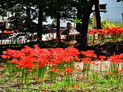 京都府八幡市野尻に、「若宮八幡宮」があります。大きな境内を有する神社ではありませんが、本殿までの参道の両側に彼岸花が咲いています。