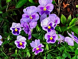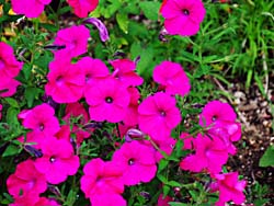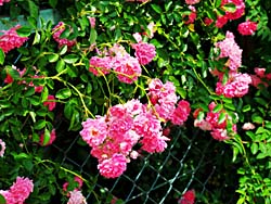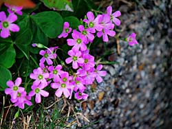 道すがら咲いていた花々です。「つるバラ」(写真左)、「ムラサキカタバミ」(写真中央)、そして「ペチュニア」(写真右)です。