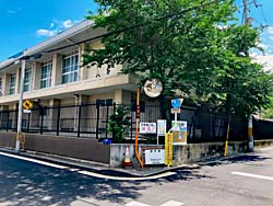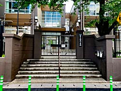 北白川小学校その2です。この辺りの囲障は、記憶にあるものでしたが改修されたらしく、新しいものになっていました。(写真左)この門は教職員専用のものでしたが、今は児童も出入りできるようでしょう。(写真中央)この建物は記憶にあるような気がするものでした。(写真右)