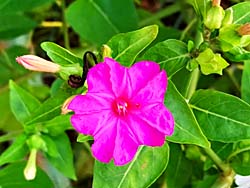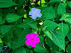 夜を彩る花の「オシロイバナ」が咲いています。赤い色がほとんどですが、白いオシロイバナを見つけました。白いのは、ほとんど見かけませんね。