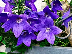 熱帯アジア原産、ナデシコ目ヒユ科の「ハゲイトウ」です。(写真中央・右)漢字では「葉鶏頭」と書きます。鶏冠(トサカ)に似ているかも。そして、キキョウ(桔梗)です。(写真左)