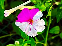 夏の夜の花、名残の「オシロイバナ」が、まだ咲いていました。白色、赤色、見事に赤色と白色が半々のミックスオシロイバナが咲いていました。
