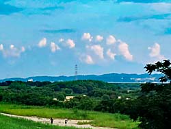 木津川の堤に「石田神社遙拝所」という石標があります。昔は石田神社を見ることが出来たのでしょうか。石田神社に行くのは、流れ橋(上津屋橋)を渡らなければなりません。空には入道雲がモクモク、木津川はこの前の大雨で中州が出来ていました。