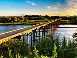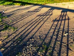 秋の夕映えに、金色に輝く流れ橋です。橋の脚の影が、このように長く伸びているのを、写真に撮すのは初めてのことでした。
