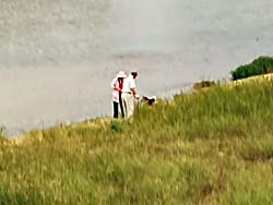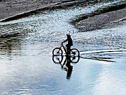 夕映えの流れ橋から木津川を眺めた三題です。 マウンテンバイクで川を渡る練習をしていました。競技大会となれば悪路を踏破する競技ですから、練習の一貫なのでしょう。 犬の散歩をしている人もいました。犬は水遊びが好きですから。 夕映えの流れ橋を撮影している人もいました。