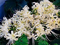 「ごんしゃん ごんしゃん どこへゆく 赤いお墓の ひがんばな」(北原白秋作詞 山田耕筰作曲)の「曼珠沙華」という歌曲です。今あちこちの草むらに咲いています。白い彼岸花(曼珠沙華)がありました。白いのは、ほとんど見ることはありません。