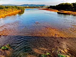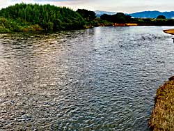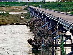 先日の台風14号の雨で、流れ橋(上津屋橋)の橋桁には流木やゴミが、このように引っ掛かっています。これだけ水位が上がって来たのかと驚きです。本流も水量も多く川幅も広くなっています。(写真中央) 日頃は砂地だったところも今は川になっています。(写真右)