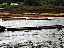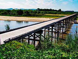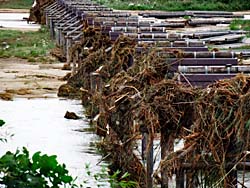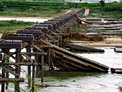 時代劇のロケ地として有名な「流れ橋(上津屋橋)」が、台風19号の影響で流れました。造られてから23回目のことだそうです。写真上段は、流れる3日前に撮影したものです。(動 画) 写真中央は、八幡市側から見たもので橋のたもとに「流れ橋」と書かれた石標があります。裏側にはご覧のように「寄贈 藤田まこと」と書かれています。必殺仕事人の中村主水がよく渡っていました。(動 画) 今は写真下段のような情景になっています。(動 画)日頃は広い河川のホンの一部しか流れていないのに、台風による増水は恐ろしいものですね。