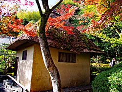 華厳寺その3です。高台にあるので、京都市内が一望でき京都タワーも望まれます。(動 画) 庭園には茶室のような建物がありますが、茶室にしては小さな窓しかなく倉庫のような感じです。杉苔の上に紅葉がきれいでした。