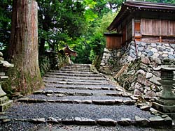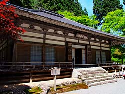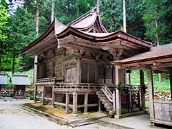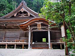 比良山荘から更に奥に進むと、「地主神社」があります。左奥にある「明王院」の鎮守で貞観元年(859)に、相応和尚の創建とされています。現在の本殿は、文亀2年(1502)に建てられたもので重要文化財に指定されています。(写真中央)、重要文化財の幣殿も文亀2年(1502)に建てられています。(写真右)