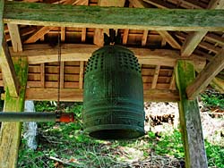 本堂の側面を見上げると駕籠がありました。何故こんなところに置いてあるの? 風雨に晒されるので大分傷んでいました。本堂前の枯山水がありました。前に川が流れているのに枯山水? そこで住職に聞くと、谷に造られた寺院なので薄暗い感じがするので、白い砂で光を反射させて明るさを、感じさせるためだと言うことでした。そして鐘楼です。