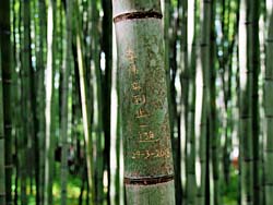 京都市右京区にある「嵯峨野」です。嵯峨野と言えば竹林ですが、竹林の中を人力車が走る(写真左)観光名所ですが、いま心無い観光客によってその竹が泣いています。写真右のように、マジックペンなどによる落書きならまだしも、ナイフ等で傷付けられています。これは酷いものです。許せません。