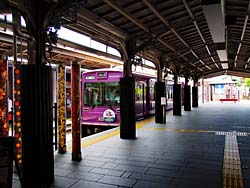 京福電車嵐山駅に入ってきたのは、京都らしい紫色の電車です。駅を出たところにこのような門構えのところがありました。通り抜け可とあったので入ると、嵯峨湯豆腐の店がありました。