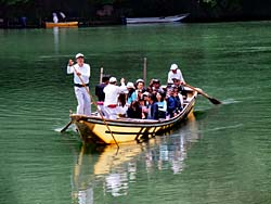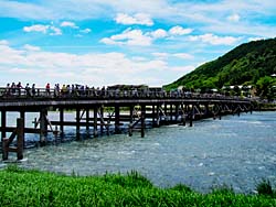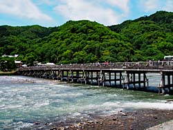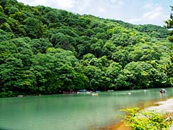 渡月橋の右側と左側で川の名前が変わります。上流を大堰川、下流を桂川です。大堰川ではボートを浮かべて舟遊びをすることができます(動 画)。「戸無瀬の滝」があります。平安時代から多くの和歌に詠まれています。江戸時代に角倉了以によって保津川の開削工事があり、滝の大部分が削り取られたそうです。(写真中央) そして保津川下りの舟です。三人の船頭によって運航されています。