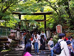 源氏物語の賢木の巻に登場する「野宮神社」です。縁結びということで若い女性が多い神社です。本殿の横に祈りを込めてなでると、願い事がかなうという「神石(亀石)」がありました。本殿の右側を行くと、庭一面に苔が植えられて緑の絨毯を敷き詰めたようでした。