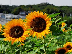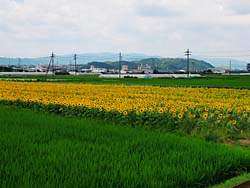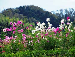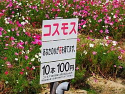 山をバックにして撮すと、いかにも人と自然が共存する里山の感がします。ここのコスモス畑は、10本100円で持ち帰ることができます。代金は筒の中に投入するようになっています。コスモスだけではなく、向日葵も咲いていました。このヒマワリも10本100円でした。