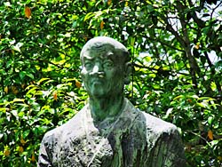 嵐山にある亀山公園には、角倉了以の銅像があります。高瀬川、大堰川等を開削し、琵琶湖疎水を完成させた田邊朔郎と共に水運の父と呼ばれています。また、この銅像は京阪三条にある「高山彦九郎像」、円山公園にある「坂本龍馬」と並んで京都三大銅像と呼ばれています。写真右は、周恩来が京都留学中に嵐山で作ったと言われている「雨中嵐山」の石碑です。