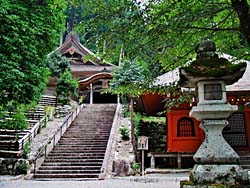 地主神社を左に行くと、「左明王院 右明王谷林道」と書かれた石標がありました。そして、明王院への朱塗りの橋、石段が続いています。