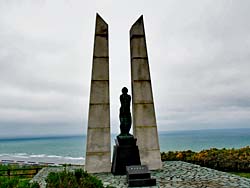 稚内公園内にある「氷雪の門」に行きました。日本の領土だった樺太で亡くなった人々の慰霊碑です。(写真左) その隣に「九人の乙女の像」があります。樺太で電話交換業務をしていた若い女性たちで、ソ連が侵攻して「皆さんこれが最後ですさようならさようなら」という別れの言葉を残して自決したということです。(写真中央) 稚内公園から見た「稚内港北防波堤ドーム」です。(写真右)