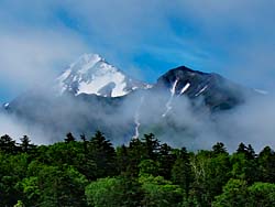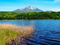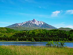 再び北海道利尻島に戻って、姫沼から18kmほど南に行くと「オタトマリ沼」があります。姫沼では、雲に隠れていました残雪を頂く、利尻山(1721m)が青空にクッキリと眺められました。素晴らしい光景です。