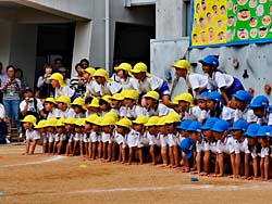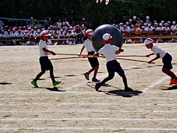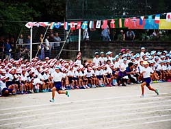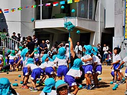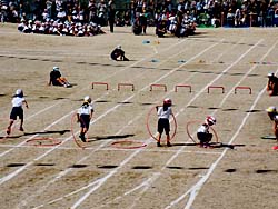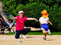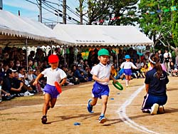 幼稚園の運動会です。年少組の徒競走は、両手を広げた先生の胸に飛び込むという微笑ましいものです。(写真中央) 年長組のリレーは、バトンではなくてリングを繋いでいくものです。園児らしいリレーです。(写真右)