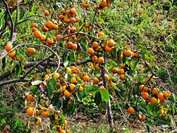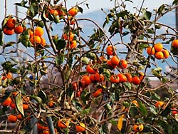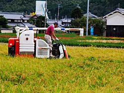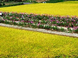 コスモスの両側には、たわわに実った稲穂が揺れています。そして稲刈りが行われていました。秋の里山には無くてはならない柿が、鈴なりに実っていました。