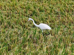 亀岡市曽我部町穴太周辺に彼岸花が咲いています。田園の畦道に咲いています。稲刈りが行われていました。刈り取ったあとに、シラサギが何かを啄んでいました。