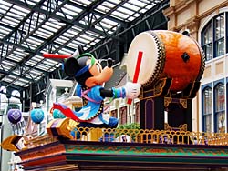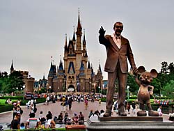 東京ディズニーランドに行きました。お馴染みのゲートを潜ると、ミッキーマウスが和太鼓を叩いて歓迎してくれました。そして、シンデレラ城を背景にウォルト・ディズニーとミッキーマウスの銅像がありました。