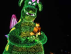 昼のパレードを見たら、次は夜のパレードです。 (動 画) バック音楽は、昔聴いたのと同じもので、懐かしかったです。それにしても、キャラクターの着ぐるみの中の人は、滝のような汗で大変だろうと思います。次に着る人は、前の人の汗と匂いで着るのに勇気がいるだろうなぁ・・・