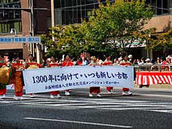 京都三大祭りの一つ「時代祭」がありました。昨年は中止だったので2年振りの開催です。御池通で見ました。平安京は794年ですから、遷都1100年の1894年に平安神宮創建と、この時代祭が実施されました。1200年の1994年には、京都コンサートホールが出来ました。平安京遷都1300年の2094年には何が記念として出来るのでしょうか。写真右は、2kmにおよぶ行列の先頭「維新勤王隊」です。(動 画)