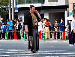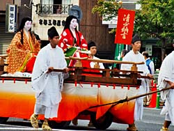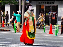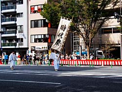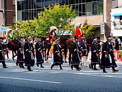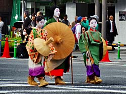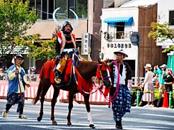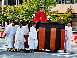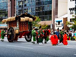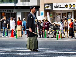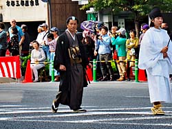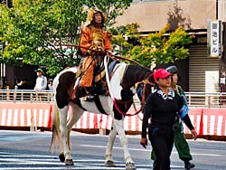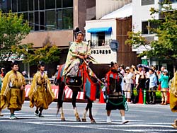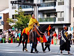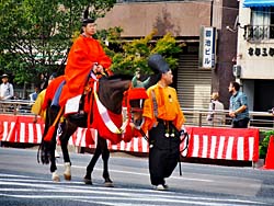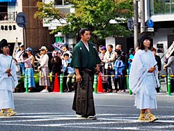 歴史は遡り平安京が誕生した延暦時代で、時代祭行列の最後になります。武官の「坂上田村麻呂」(写真左)、文官(写真中央)、神幸列(写真右)です。