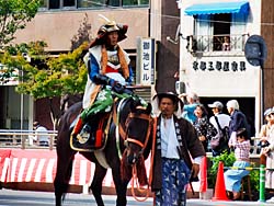 歴史は更に遡り、楠木正成の上洛行列です。元弘3(1333)年、後醍醐天皇が隠岐から還幸された際に、楠木一族が先駆として上洛しました。左から「侍大将」、「副将の楠木正季」、そして「主将の楠木正成」です。