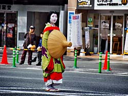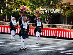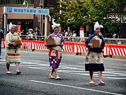 京の都で行商をしていた女性たちで、左から現在の左京区大原から薪を売っていた「大原女(おはらめ)」、西京区桂から桂川の鮎や飴などを売った「桂女(かつらめ)」、左京区北白川から花を売った「白川女(しらかわめ)」です。大原女や白川女は、商品を頭に乗せて売り歩くのが特徴です。